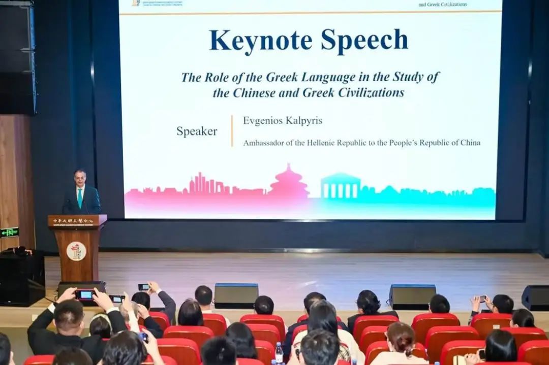 希腊共和国驻华大使卡尔佩里斯进行了题为“希腊语在中希文明研究中的角色”的主旨演讲。中希两大文明历经千年发展,相互影响,促进文明对话需要系统性研究,避免简单对比。他着重阐述了希腊语在探索西方思想根源方面的独特价值,希望同学们通过研习希腊语,解码西方思想的“源代码”,洞悉古代文明的深层逻辑。他呼吁青年学子积极担当文化交流使者,主动搭建起连接中国与希腊、东方与西方的文化桥梁,为促进世界文明的对话与交融注入新活力。