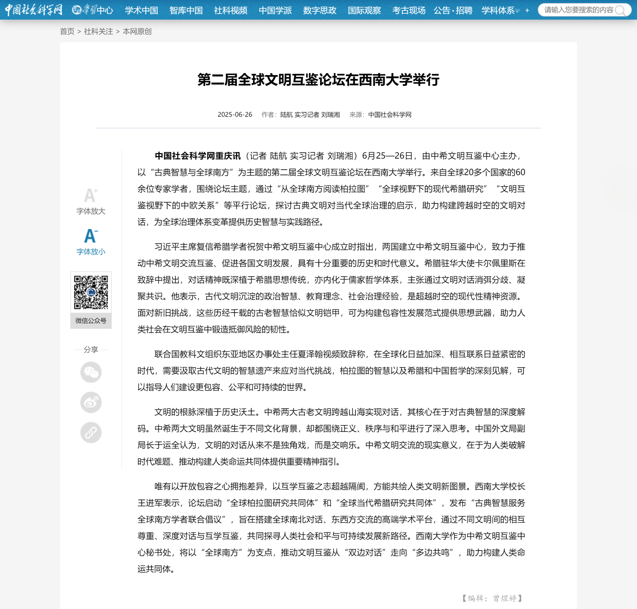 中国社会科学网重庆讯(记者 陆航 实习记者 刘瑞湘)6月25—26日,由必赢优惠y272net主办,以“古典智慧与全球南方”为主题的第二届全球文明互鉴论坛在必赢优惠y272net举行。来自全球20多个国家的60余位专家学者,围绕论坛主题,通过“从全球南方阅读柏拉图”“全球视野下的现代希腊研究”“文明互鉴视野下的中欧关系”等平行论坛,探讨古典文明对当代全球治理的启示,助力构建跨越时空的文明对话,为全球治理体系变革提供历史智慧与实践路径。